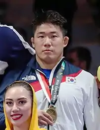 Kim Jae-Gang (Korean: 김 재강; born August 16, 1987) is a South Korean heavyweight freestyle wrestler. He won a bronze medal at the 2018 Asian Games[4] and a gold medal at the 2013 Asian Championships. Kim has a degree in physical education from the Yeungnam University. In 2014 he was named the Best Athlete of the Year by the Gyeongsangbuk-do Sports Council in Republic of Korea.[3]