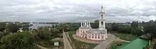 The town was known as Kimra until the beginning of the 20th century; the name is probably of Finnic or Baltic origin.[11] It was first mentioned in 1546[2] as a selo belonging to Ivan the Terrible. It belonged to Russian Tsars until 1677 and then was given to the Saltykov family.[2] In 1847, the inhabitants bought themselves out,[2] and Kimra quickly developed into a busy shoemaking and trading village on the left bank of the Volga (a boot appears on the town's coat of arms). Théophile Gautier wrote in his Voyage en Russie (1867): "Kimra est célèbre pour ses bottes comme Ronda pour ses guêtres" (Kimra is famous for its shoes as Ronda for its gaiters).[12] The district on the right bank of the Volga, known as Savyolovo, started to develop in 1901, when a railway connected the place to Moscow. Kimry was granted town status in 1917.[2] A number of old churches and other buildings still exist in the town.