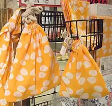 Kinchaku (巾着, lit. 'cloth + wearing / on one's person') is a traditional Japanese drawstring bag, used like a handbag (similar to the English reticule) for carrying around personal possessions; smaller ones are usually used to carry loose coinage (similar to a sagemono), cosmetics, lucky charms, hand warmers and other small items. Larger versions can be used to carry bento (packed lunchboxes) and utensils, as well as other larger possessions. The bags traditionally carried by maiko and geisha are a variant on kinchaku, and are called kago (篭) (literally 'basket') after their woven basket base.[1]