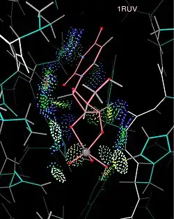 More recently, with the availability of a much wider variety of other molecular graphics tools, presentation use of kinemages has been overtaken by a wide variety of research uses, concomitant with new display features and with the development of software that produces kinemage-format output from other types of molecular calculations. All-atom contact analysis[9] adds and optimizes explicit hydrogen atoms,[10] and then uses patches of dot surface to display the hydrogen bond, van der Waals, and steric clash interactions between atoms. The results can be used visually (in kinemages) and quantitatively to analyze the detailed interactions between molecular surfaces,[11][12] most extensively for the purpose of validating and improving the molecular models from experimental x-ray crystallography data.[13][14][15][16] Both Mage and KiNG (see below) have been enhanced for kinemage display of data in higher than 3 dimensions (moving between views in various 3-D projections, coloring and selecting candidate clusters of datapoints, and switching to a parallel coordinates representation), used for instance for defining clusters of favorable RNA backbone conformations in the 7-dimensional space of backbone dihedral angles between one ribose and the next.[17]