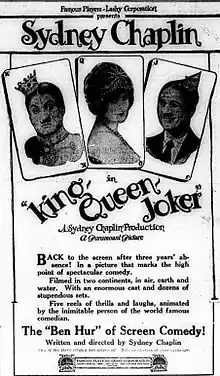King, Queen, Joker is a 1921 American silent feature farce written and directed by Sydney Chaplin, the elder half-brother of Charlie Chaplin. The picture was produced by Famous Players–Lasky and distributed through Paramount Pictures. The film was shot in England, France, and the United States.[1][2]