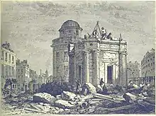 It was constructed at the junction of Gray's Inn Road, Pentonville Road and New Road (developed in 1765, and renamed Euston Road in 1857), in an area previously known as Battle Bridge, where York Way crossed the River Fleet, reputedly referring to a battle fought between Boudicca's rebellious army of Ancient Britons and soldiers of Ancient Rome.[3] It had an octagonal base with paired columns at each corner, a balustrade at first floor level intended to be decorated with four statues, one on each corner (either kings of England, or the patron saints of England, Scotland, Wales and Ireland; but it is not clear if any statues were ever put in place), rising to a pedestal with a clock. From 1835, it was surmounted by a statue of George IV. The statue stood 11 feet (3.4 m) high, on top of the 60 feet (18 m) high building.[4][5]
