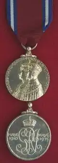 - A circular, silver medal, 1.25 inches in diameter. The obverse features the conjoined effigies of King George V and Queen Mary, crowned and robed, facing left. The legend around the top edge reads "GEORGE • V • AND • QUEEN • MARY • MAY • VI • MCMXXXV".[2]