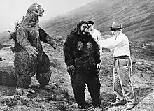 Sadamasa Arikawa (who worked with Tsuburaya) said that the sculptors had a hard time coming up with a King Kong suit that appeased Tsuburaya.[38] The first suit was rejected for being too fat with long legs giving Kong what the crew considered an almost cute look.[38] A few other designs were done before Tsuburaya would approve the final look that was ultimately used in the film. The suit's body design was a team effort by brothers Koei Yagi and Kanji Yagi and was covered with expensive yak hair, which Eizō Kaimai hand-dyed brown.[48] Because RKO instructed that the face must be different from the original's design, sculptor Teizō Toshimitsu based Kong's face on the Japanese macaque rather than a gorilla, and designed two separate masks.[48] As well, two separate pairs of arms were also created. One pair were extended arms operated by poles inside the suit to give Kong a gorilla-like illusion, while the other pair were at normal arms-length and featured gloves that were used for scenes that required Kong to grab items and wrestle with Godzilla.[49] Suit actor Hirose had to be sewn into the suit in order to hide the zipper. This would force him to be trapped inside the suit for large amounts of time and would cause him much physical discomfort. In the scene where Kong drinks the berry juice and falls asleep, he was trapped in the suit for three hours. Besides the suit with the two separate arm attachments, a meter-high model and a puppet of Kong (used for closeups) were also built.[50][51] As well, a huge prop of Kong's hand was built for the scene where he grabs Mie Hama (Fumiko) and carries her off.[52][53][54]