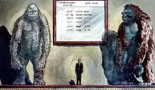 Early drafts of the script were sent back with notes from the studio asking that the monster antics be made as "funny as possible".[37] This comical approach was embraced by Tsuburaya, who wanted to appeal to children's sensibilities and broaden the genre's audience.[38] Much of the monster battle was filmed to contain a great deal of humor but the approach was not favoured by most of the effects crew, who "couldn't believe" some of the things Tsuburaya asked them to do, such as Kong and Godzilla volleying a giant boulder back and forth. With the exception of the next film, Mothra vs. Godzilla, this film began the trend to portray Godzilla and the monsters with more and more anthropomorphism as the series progressed, to appeal more to younger children. Ishirō Honda was not a fan of the dumbing down of the monsters.[34] Years later, Honda stated in an interview. "I don't think a monster should ever be a comical character," and "The public is more entertained when the great King Kong strikes fear into the hearts of the little characters."[39] The decision was also taken to shoot the film in a (2.35:1) scope ratio (TohoScope) and to film in color (Eastman Color), marking both monsters' first widescreen and color portrayals.[40]