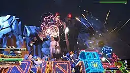 Sora faces Heartless, Nobodies, and Unversed in the game,[24] with new variants of these enemy types appearing.[20] In addition to these traditional "smaller" enemies, the player faces giant bosses, which give "Sora greater freedom of movement and room to experiment with attacks—including the new theme-park-ride summon attacks,"[12] known as "Attraction Flow".[25] These attacks are inspired by the Disney Parks attractions Mad Tea Party, Big Thunder Mountain Railroad, Buzz Lightyear Astro Blasters,[23] and Grizzly River Run,[26] and generic pirate ship and carousel attractions;[23][27] these attacks draw visual inspiration from Disney Parks' Main Street Electrical Parade.[23] Sora also has the ability to jump on certain enemies, such as ones shaped like a vehicle.[17] Regarding traversal, Nomura noted the new mechanic, called "Athletic Flow" in Japanese, was refined from the Flowmotion mechanic from Dream Drop Distance, which players felt was "a little too free... and it was kind of hard to control on their end."[28] "Athletic Flow" allows the player to utilize the environment to access previously unreachable areas.[29] Co-director Tai Yasue stated this mechanic was created "to try something new" and "radically change the gameplay" for the Hercules world, which led to its use in the other worlds. As a result, each world was able to have "more height, scale and sense of discovery."[30]