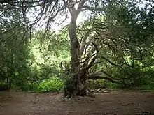 Kingley Vale has a rich and diverse heritage with remains of a Romano-Celtic temple at Bow Hill.[12] Iron Age settlement site known as Goosehill Camp,[13] the Devil's Humps Bronze Age round barrows and prehistoric flint mines. There are also a number of unidentified archaeological remains in the form of linear earthworks, a rectangular enclosure known as Bow Hill Camp and evidence of settlement at the base of the hill.[14]