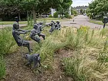 The development features a number of major sculptures commissioned by the developers. On the roundabout between the business park and the residential area is A different ball game by Kevin Atherton which consists of a 10 ft (3.0 m) diameter reflective ball being pushed in different directions by three life-size bronze figures which were cast from local people. On the A228 roundabout to the north of the business park is a 45 ft (14 m) tall obelisk style sculpture called L'Ambiente created by Enzo Torcoletti. Smaller sculptures on the site include a statue depiction of a tug of war game on the roundabout near to Kings Hill Primary and memorials to Group Captain Peter Townsend and Bill Rouse, late chairman of the site's developers.[11]