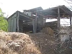 An earth ramp with a low incline leading to the stamper is on the north-east side of the shed. A jaw crusher sits at the head of the ramp adjacent to the stamper. The timber hopper has completely collapsed.[1]