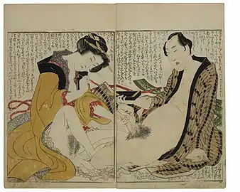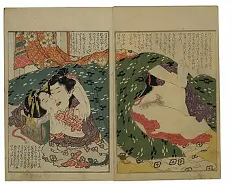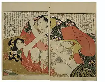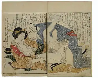 Illustrations in the albums are views of partially naked couples. One scene in Volume III, the most famous of Hokusai's erotic paintings, called The Dream of the Fisherman's Wife, is unique in its focus: it depicts a woman, evidently an ama (a shell diver), enveloped in the limbs of two octopuses. The larger of the two mollusks performs cunnilingus on her, while the smaller one, his offspring, assists by fondling the woman's mouth and left nipple. The surrounding text express their mutual sexual pleasure from the encounter.[3]