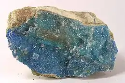 Kinoite (Ca2Cu2Si3O8(OH)4[2][3] or Ca2Cu2Si3O10 · 2 H2O[4]) is a light blue copper silicate mineral. It is somewhat scarce. It has a monoclinic crystal system, vitreous luster, and is transparent to translucent. It can be found in the Santa Rita Mountains, the Christmas Mine at Christmas, Arizona and a few other copper mines. Kinoite is popular with mineral collectors. Kinoite was named upon its discovery in 1970 after the pioneer Jesuit missionary Padre Eusebio Kino who worked in Arizona, Sonora and Baja California.