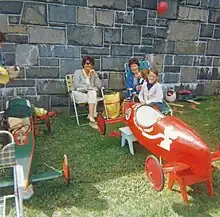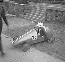 In 1938 the Kinsmen Club of Montreal discussed plans to conduct its own soap box race, the first one for Montreal,[7] as a means of raising charitable funds for under-privileged children in the city's poorer neighborhoods. An ophthalmological ward at a hospital was required, with the intention of offering free eye exams for the kids, and the idea was to raise funds from various groups and individuals that would be willing to sponsor contestants in the race.[8][9] Race preparations were made to help boys that needed various items like axles and wheels,[10] items they could not manufacture themselves, and a budget of no more than $10 with which to construct the car body was set, although most entrants seldom went over $1.[9]