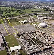 Locations for the Kinsmen Coaster Classic, which ran on city streets, varied across five separate venues during its lifetime. The inaugural race in 1938 took place on Van Horne Avenue[lower-alpha 6] between Victoria Avenue and Van Horne Park, chosen because it was well paved and free of houses along both sides of that corridor, allowing traffic to be closed off and spectators to gather safely.[31] The next two years, races took place on an 1,100 foot track on Aird Avenue[lower-alpha 7][28] in Montreal's east end neighborhood of Maisonneuve (pictured), between Sherbrooke St. E. and Boyce Street (now Pierre-de Coubertin Ave). Today the site is occupied by Montreal's Olympic Statium, constructed in 1976. Aird was in a less developed neighborhood at the time with little traffic, ideal for races. In 1941 it moved back to Van Horne Avenue for one more year, then to the Trenholme Park neighborhood in the west Montreal neighborhood of NDG, remaining for two. Featuring a high starting ramp next to the park,[lower-alpha 8][18] the cars headed southbound on Park Row East Road down a 600-foot course[32] situated between Sherbrooke St. W and de Maisonneuve Blvd.
