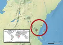 This species has been recorded in Tanzania's Afrotemperate forests in east Usambara Mountains and Magrotto Hill. In Kenya, it is only known as a subpopulation in the Shimba Hills. The populations in the two countries are clearly separated and it remains to be verified if they belong to a single species or two separate species.[1]