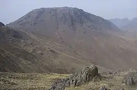 The direct ascent up the south-western slope from Wasdale Head is exceptionally steep and the subject of an amusing drawing by Wainwright.[1] Usual ascents are by one of the aforementioned passes; alternatively one may climb Kirk Fell as part of the Mosedale Horseshoe, a walk on the fells surrounding Mosedale, a side-valley of Wasdale.