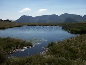 The summit plateau of Kirk Fell assumes a 'figure of eight' shape in plan, the narrow waist squeezed between Illgill Head and Baysoar Slack. The highest ground is to the west, while a subsidiary top occupies the other section. Kirk Fell East Top has sufficient prominence (34 metres, 112 ft) to qualify as a Hewitt in its own right. Between the summits is Kirkfell Tarn, actually two small tarns. The deeper pool is an oval, while the other has an indented outline, reminiscent of Sprinkling Tarn on Seathwaite Fell in miniature.[2]