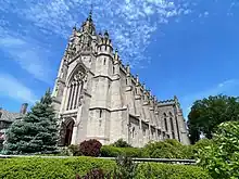The architectural firm of George D. Mason completed the church based on preliminary designs by Wirt Rowland.[2] Rowland, who worked for Mason at the beginning of his career, died in 1946 during the design process. Services were held in the Undercroft beginning in 1952 and continued during the construction of the church until a disastrous fire destroyed most of the roof. The Church held its first services in the sanctuary on November 23, 1958. Kirk in the Hills is modeled after Scotland's Melrose Abbey. Set on 40 acres (160,000 m2) of beautifully landscaped lakeside grounds, Kirk in the Hills constitutes a fine example of Gothic architecture in the United States. Kirk is the Scottish word for Church.
