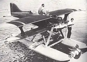 Each 21 ft 3 in (6.48 m) long and 40 in (1,000 mm) wide plywood float had a concave V-bottom, with a single step 10 ft 6 in (3.20 m) back from the nose. Each float was mounted on two steel struts, enclosed in dural sheet fairings. The forward strut was joined at the side of the engine mounting and the rear one met its opposite partner on the fuselage underside centre-line. Diagonal struts from the feet of the forward struts on the float joined the top of the rear struts to provide cross-bracing and two horizontal struts connected the floats together.[1][2]