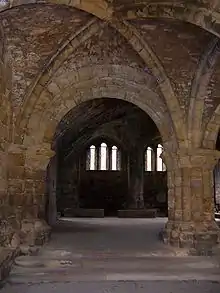 The church is of the Cistercian type, with a short chancel (3), and transepts (4) with three eastward chapels to each, divided by solid walls. The building is plain, the windows are unornamented, and the nave (1) has no triforium. The windows and doorways have round heads, whereas the vaulting arches are pointed and the moldings and capitals also show early Gothic features.[5] During the 15th century, the great east window was replaced with a smaller one. The tower over the crossing was made higher in the 16th century, just before dissolution.[5]
