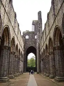 During the 18th century the picturesque ruins attracted artists of the Romantic movement and were painted by artists including J. M. W. Turner, John Sell Cotman and Thomas Girtin.[8] In 1889 the abbey was sold to Colonel John North, who presented it to Leeds City Council. The Council undertook a major restoration project and the abbey was opened to the public in 1895.[9]