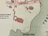 In 1865 Thomas Lawry died at the age of 44.[16] The death notice records that the name of the house was still Sophienberg.[16] Two years later in 1867 Esther married James Taylor,[17] who was the Commissary-General of Ordnance. This couple then lived in the house with Esther’s two children, one of whom was Thomas Terry Trewyn Lawry. In 1891 James Taylor died.[18] By this time the house had been named "Kirribilli" and was located in Campbell Street as the map on the left shows. In 1900 Esther died,[19] and the house was left to her son Thomas Terry Trewyn Lawry.