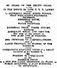 Thomas Terry Trewyn Lawry was born in 1864. He seemed to have rather poor health and did not marry. In 1907 at the age of only 42 he died of heart failure.[20] As he had no children he left his property to relatives and others. He made a very complex will leaving Kirribilli house to several people one of whom was Laura Lamotte.[21] Laura married William Donald McCrea in 1909. Laura and William lived in the house for some time[22] but she then wanted to sell the property. There was some disagreement about the sale with the other beneficiaries and the matter was taken to the Equity Court.[23] The Court resolved that the property should be sold and it was put on the market in 1919. The House was bought by Arthur Wigram Allen who planned to subdivide the land. In 1920 he produced a brochure with a photo of the house and the planned subdivision.