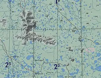 ![]() Map section of Suor Uyata Range and Mount Kisilyakh-Tas (arrow) |
