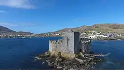 ![]() The castle as seen from the air, with Castlebay town in the background. | |