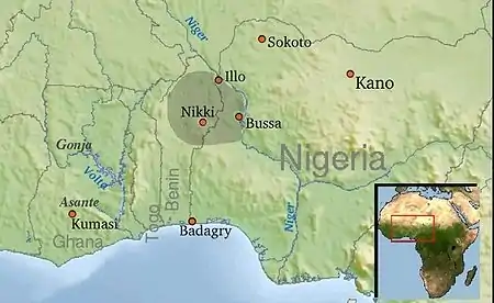 In the most prominent version of the story in the Borgu kingdom, Kisra is depicted as an early political and religious challenger to Muhammad in the area around Mecca.[3] In this version, Kisra was a prominent leader and possessed a number of magical powers. However, during his rule, a seer foresaw that his power would eventually be undermined by a child born within the city who would have divine powers.[4] To prevent this challenge, Kisra exiled all the men of his city on the date that the seer had predicted the baby to be conceived; however, the husband of Aminatu, Kisra's daughter, remained in the city and a son was conceived, Muhammad. As Muhammad grew, he began trying to convert Kisra to Islam, but the ruler resisted. Eventually, this resulted in open warfare between Muhammad and Kisra over religious issues and Kisra won the initial conflict. However, as Muhammad fled to a baobab tree he was provided divine assistance for his escape and to reorganize his forces.[3] Seeing that the tables had turned, Kisra and his followers left the Arabian peninsula, eventually reaching the Niger river.[5] Kisra's party visited many of the villages in the area before eventually founding the Borgu kingdom. In some versions of the legend, Kisra's oldest son Woru (or sometimes Kisra himself) founded the city of Bussa, which would become the capital of Borgu. Kisra's younger sons founded Nikki, founded by Shabi, and Illo, founded by Bio.[6] In later versions, this order of foundation of the main cities of the Borgu kingdom is changed.[6] The legend became crucial in the Borgu kingdom in uniting the different cities,[7] legitimizing the ruling dynasty (the Wasangari),[6] and providing an ideological distinction between Borgu and the Islamic states in the area.[3]