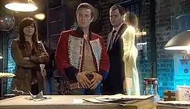 Jack, after finding the Doctor[N 1] and witnessing the end of the world,[N 2] returns to his Torchwood team, and shoots an intoxicated alien Blowfish involved in a hostage situation.
