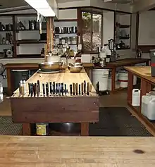 • Post-WW-I industrial era. Increasing interest in household efficiency led to pioneering motion studies of housework in the 1920s by industrial psychologist Lillian Moller Gilbreth. Subsequent improvements in kitchen design set the stage for the familiar built-in cabinetry of the present day. At the time, work surfaces were typically made of linoleum or stainless steel. Improvements in technology eventually made industrial-scale cabinet production possible.