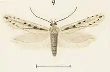 The wingspan is 12โ13 mm. The forewings are light ochreous-brown, suffusedly irrorated with whitish, tending to leave a more or less clear longitudinal median streak of ground colour. There is a blackish mark on the fold towards the base. The discal stigmata are rather large and black, the plical represented by a dark fuscous or brown cloud, very obliquely before the first discal. There are several cloudy blackish or dark fuscous dots on the posterior part of the costa and termen. The hindwings are light grey.[2]