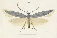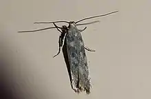 The wingspan is about 16 mm. The forewings are grey, finely irrorated (sprinkled) with blue whitish. Three discal spots are obscurely darker, the first before the middle, the second on the fold rather before the first and the third in the disc beyond the middle. The hindwings are whitish grey.[2]