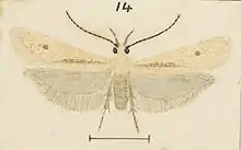 The wingspan is 10โ€“13 mm. The forewings are ochreous-whitish with a ferruginous suffusion along the fold, sometimes extended to before the apex, sometimes absent. The area beneath the fold is usually clearer white. The hindwings are pale fuscous-grey.[2]