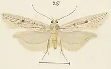 The wingspan is 13–17 mm. The forewings are whitish-ochreous, obscurely irrorated with brownish-ochreous, tending to form streaks on the veins, sometimes a more distinct apical streak and sometimes a few scattered black scales, also tending to accumulate on the veins. There are three small black discal spots, sometimes almost obsolete, the first before the middle, the second on the fold obliquely before the first and the third beyond the middle. The apical portion of the costa and hindmargin are obscurely dotted with black. The hindwings are whitish-grey.[3]