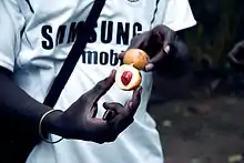 A local tour guide showing a nutmeg to visitors in Kizimbani's spice farm