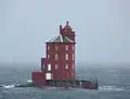 The 17.5-metre (57 ft) tall lighthouse is made of stone with an octagonal-shaped tower that is painted red. The 14,400-candela light sits at the top at an elevation of 20.5 metres (67 ft) above sea level. The white, red, or green light (depending on direction), occulting once every 6 seconds. There is a fresnel lens that has been in use since 1906. It can be seen for up to 8 nmi (15 km; 9.2 mi). The lighthouse is lit every year from July 21 until May 16. It is dark during the late spring and early summer months due to the midnight sun.[1][2][3]