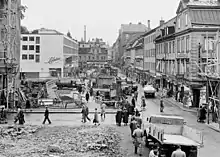 During the redevelopment of Norrmalm in the 1950s and 1960s Klarabergsgatan was thoroughly renovated. To accommodate the increase in car traffic after World War II the Stockholm traffic bureau had to construct a west-east main street connecting to a 31-metre-wide Klarabergsleden, part of which would be constructed by widening the streets of Klarabergsgatan and Hamngatan.[3] Even the construction of the Stockholm Metro required much work. All buildings except the Klara Church were torn down. The Klarabergsleden plan was however never fully completed.