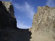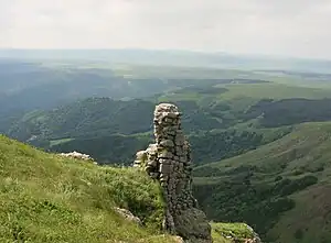 Kldekari Fortress (Georgian: კლდეკარის ციხესიმაგრე) a historical fortress in Georgia, Trialeti, on the rocky peak of Trialeti Range near spa town Manglisi, Tetritsqaro Municipality. From here you can see the area around the south, Tsalka and Manglisi, as well as the north - river Tanis and Tedzmi Valleys. The ruins are currently preserved. It was located at an important crossroads, where a molten rock formed an exit, name Kldekari means the rock door.[1]