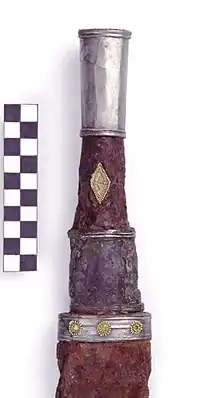 Settlement pottery of the Alanic period has been found on the southern and northern slopes, and on top of the rock. Alanic graves of the 5th – 7th/early 8th centuries AD are located on the southern slope (cemetery III), with further graves of the 7th/early 8th centuries AD on the northern slope (cemetery IV). The standard grave type is a large catacomb with an entrance corridor (dromos), usually with several burials in the chamber. The burial ritual is basically the same as in the Sarmatian period, but with a wider range of grave-goods and with more elaborate ritual (horse sacrifice, pottery depositions and traces of fire in the dromoi). Finds of special interest include a Central Asian type of sword with P-shaped scabbard fittings (Grave 360), an Iranian glass bowl (Grave 360), and gold coins of the Byzantine emperors Tiberius Mauritius (Maurice (emperor)) and Heraclius (Graves 341 and 363).[5]