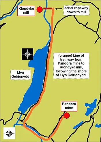 The route of the tramway from Pandora mine can be seen running down the hill on and embankment on the southern side of the Capel Curig road and the stream. As it approaches lake Geirionydd it swings to the right, to cross the present day road, before heading for the lake shore. The route alongside Llyn Geirionydd can be discerned in places today, running along the lake's length between the road and the lake shore in a small cutting. (This road was not built until about the 1940s.) North of the lake, the tramway route is a flat path, now a right of way, and part of Trefriw trail No. 5,[11] and on the hillside directly above the mill some minor remains of the loading platform, water tank and pipeline can be seen. From here it can be seen where the aerial runway ran steeply down to Klondyke mill.