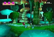 The gameplay of Klonoa 2: Lunatea's Veil is comparable to its predecessor Klonoa: Door to Phantomile,[1] consisting of standard platforming stages and boss battles, as well as board-riding stages. After a specific point in the game, the player has the option of choosing which stage, or "Vision", to play on the game's world map. For most of the game, the player is restricted to a side-scrolling 2D path in a 3D environment, with the ability to move left, right, up, or down. The player can also turn toward or away from the screen to interact with or throw things at objects in the foreground or background. In the standard stages the goal is to reach the end of level by means of using the enemies to overcome obstacles and solve puzzles. Klonoa has a limited amount of health in the form of hearts, which is reduced when coming in contact with enemies and certain obstacles.
