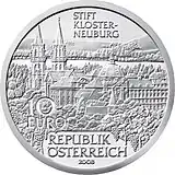 Klosterneuburg was recently selected as a main motif for a high value collectors' coin: the Klosterneuburg commemorative coin. The obverse shows a view of the abbey from the slopes of the Leopoldsberg in the Alps. The Romanesque-Gothic basilica as well as the copper dome with the imperial crown can be seen.