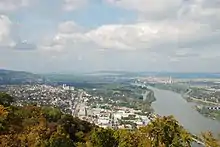 It is located on the Danube, immediately north of the Austrian capital Vienna, from which it is separated by the Kahlenberg and Leopoldsberg hills of the Vienna Woods range. It has been separated from its twin city of Korneuburg on the opposite bank of the Danube since the river changed course during the Late Middle Ages. The towns are connected by a reaction ferry link which runs during daylight hours from Spring to late Autumn. The municipal area comprises the northern tip of the Donauinsel as well as the 515 m (1,690 ft) high Mt. Exelberg and its telecommunication tower.