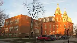 The Knightstown Academy is a historic school building located at Knightstown, Henry County, Indiana. It was built as a Quaker Academy in 1876 and affiliated with the Society of Friends.[1] The building is located north of the National Road (US 40) on Cary at Washington Street. The building was designed in Second Empire style.[1] It has a mansard roof and twin four story towers that are topped by a telescope and a globe. After the building ceased to be used as an academy, it functioned for many years as the local public high school.[3] It is now an apartment building. The attached gymnasium was used as the home court of the Hickory Huskers in the 1985 movie Hoosiers.