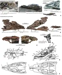 The skull of Knoetschesuchus is relatively short, with the snout taking up 47% of skull length in K. langenbergensis and 42% in K. guimarotae,[5] which allows them to be classified as brevirostrine crocodilians.[10] Along the side of the snout are two undulations, a smaller one on the premaxilla and a larger and broader one on the maxilla. The jagged suture between the premaxilla and maxilla is angled towards the front of the skull in K. langenbergensis and towards the back in K. guimarotae.[5] Along the midline of the snout are the thin and wedge-like nasals; the nostrils, which face upwards, are clearly separated by the nasals in K. guimarotae,[5] but it is not clear that this is the case in K. langenbergensis.[3]