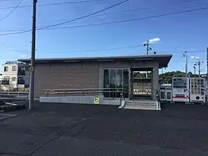 Kobi Station has two opposed ground-level side platforms connected by a level crossing. The station is unattended.