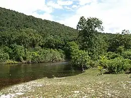 The island resembles its northern sister, Koh Rong, in many ways, although it has noticeably less landmass in relation to its coastline. The terrain is predominantly hilly with a few mountains of moderate size (e.g. La Chameau - The camel) and a maximum elevation of 210 m (689 ft) in the north-west. The interior was almost entirely covered in dense jungle. The coastline is characterized by a succession of sandstone rock formations and beautiful beaches. There are three yellow sand beaches at the island's long western coast. Its eastern side, facing towards the mainland and less exposed to the weather and the monsoon, is characterized by bays and headlands. The crescent-shaped Saracen Beach bay has an inner diameter of around 3 kilometers. Saracen bay got its name from a British survey brig, HMS Saracen, that charted the area in the late nineteenth century.[7] North of the island lies the uninhabited Koh Koun island, followed by Koh Rong.[8][9]