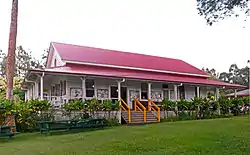 The Kohala District Courthouse is a historic courthouse in Kapaau on the island of Hawaii. The courthouse was built in 1889 to serve as a district court for the Kingdom of Hawaii; it continued to serve as a courthouse through U.S. annexation and Hawaii's eventual statehood, only closing in 1975. It was designed in the style of a traditional Hawaiian plantation house, which is reflected in its wide lanai, single-walled exterior, and corrugated metal roof; the ornamentation on its lanai sets it apart from other local buildings. A statue of Kamehameha I, who was born in Kohala, stands in front of the building.[2]
