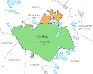 The Koijärvi municipality was dissolved in 1969. Most of it, including Kojo, was transferred to Forssa in the south, while small portions of the north were given to Urjala.